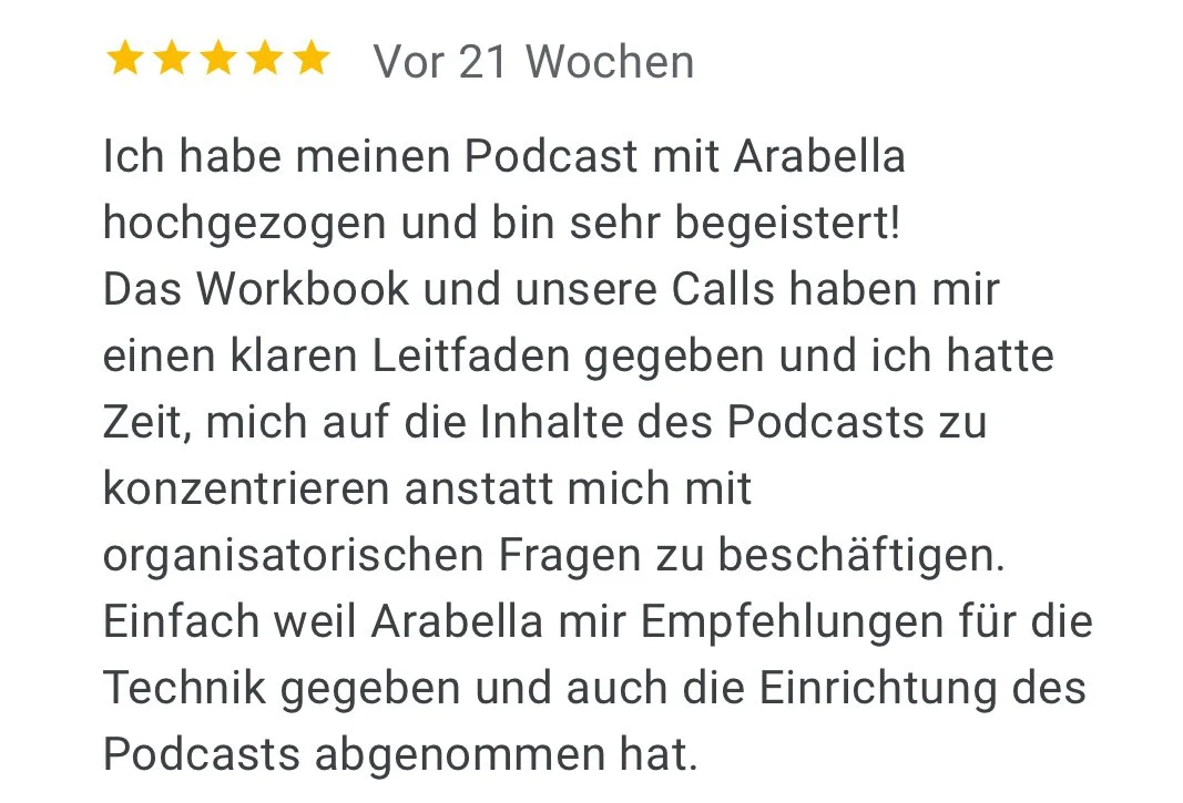 „Ich habe meinen Podcast mit Arabella hochgezogen und bin sehr begeistert! Das Workbook und unsere Calls haben mir einen klaren Leitfaden gegeben und ich hatte Zeit, mich auf die Inhalte des Podcasts zu konzentrieren anstatt mich mit organisatorischen Fragen zu beschäftigen. Einfach weil Arabella mir Empfehlungen für die Technik gegeben und auch die Einrichtung des Podcasts abgenommen hat.“