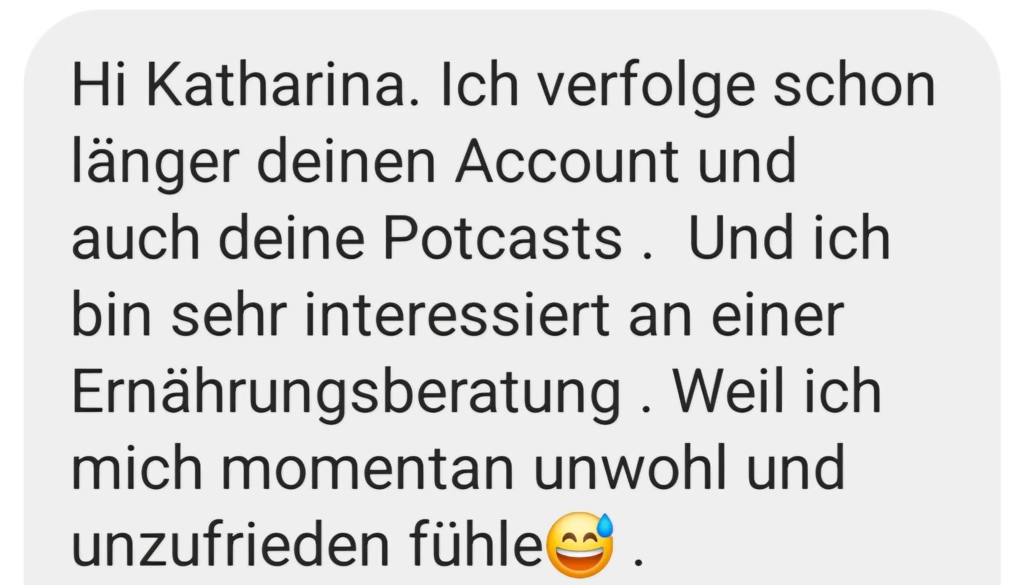 „Hi Katharina. Ich verfolge schon länger deinen Account und auch deinen Podcast. Und ich bin sehr interessiert an einer Ernährungsberatung, weil ich mich momentan unwohl und unzufrieden fühle.“